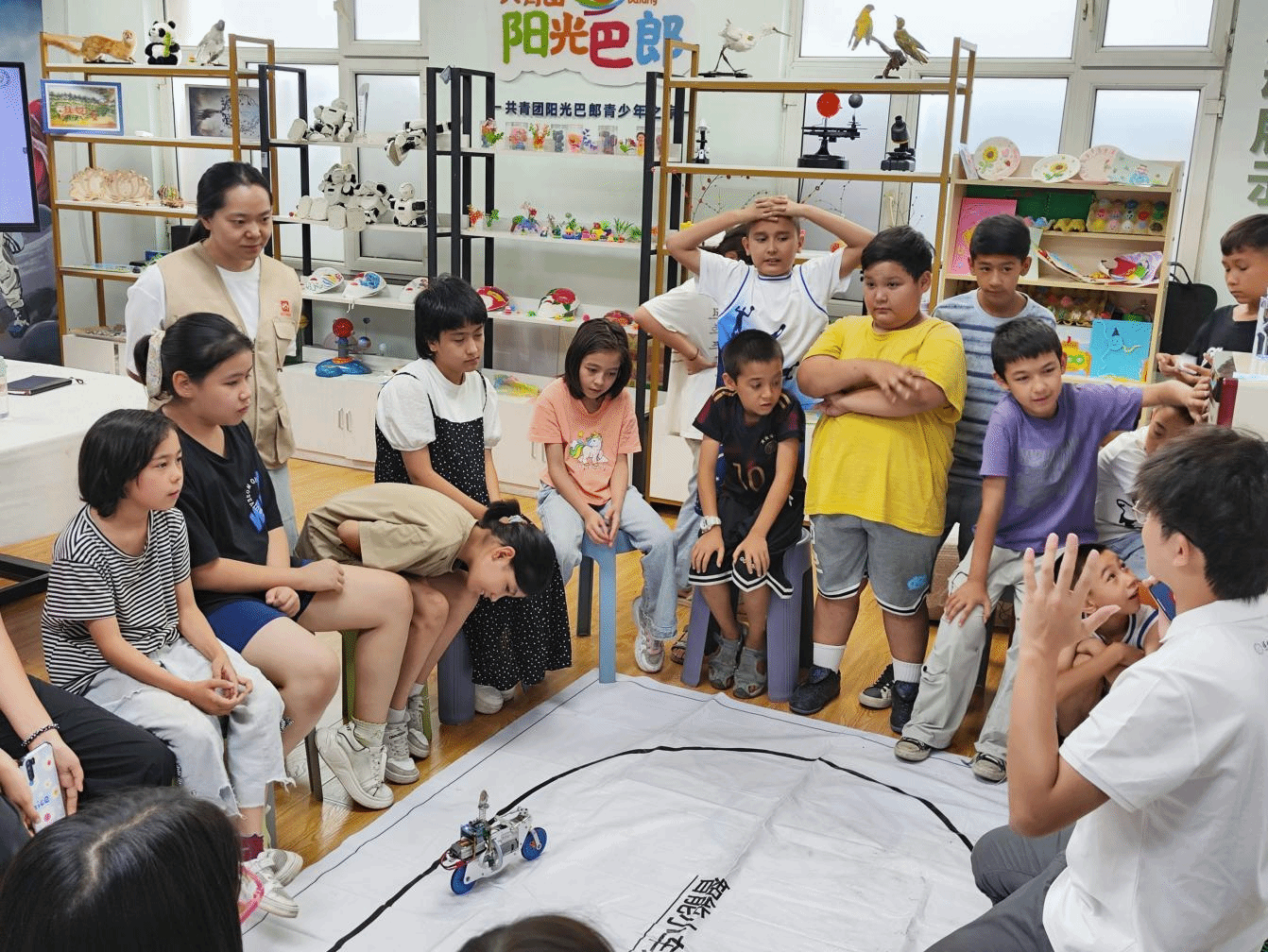 臻工创新党支部党员、智能车俱乐部硬件技术顾问、实践队员许捷成通过沉浸式体验环节,带领孩子们揭开智能小车的神秘面纱。从常见的汽车到会“思考”的智能车,现场演示“无人控制驾驶”,让孩子们直观感受传感器如何让车辆实现自主按照规划路线前进;同步讲解陀螺仪与平衡算法的协作机制,让无人两轮车、独轮车在地上保持平衡,哪怕受到干扰也不会倒下,引发阵阵惊呼。